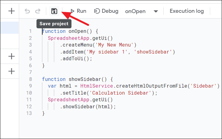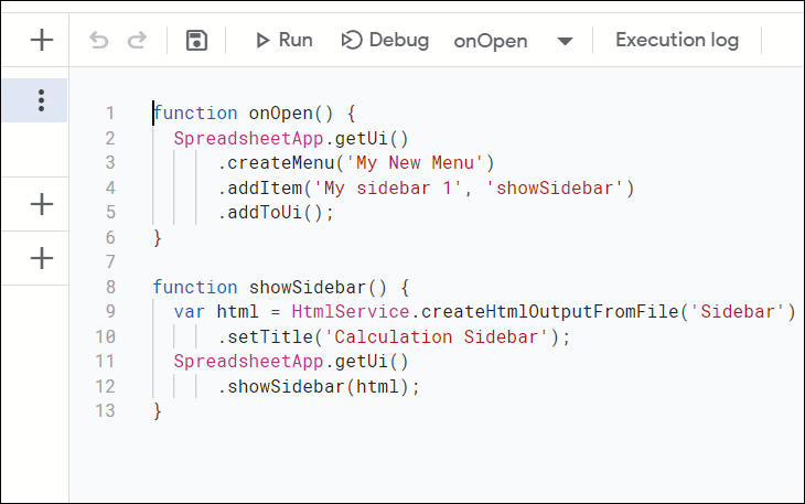 The onOpen() function in this script adds a custom menu called My New Menu to the Google Sheets menu bar. Inside this menu, there's an item labeled My sidebar 1. Clicking this item will execute the showSidebar() function, which displays the sidebar on the right side of your sheet.