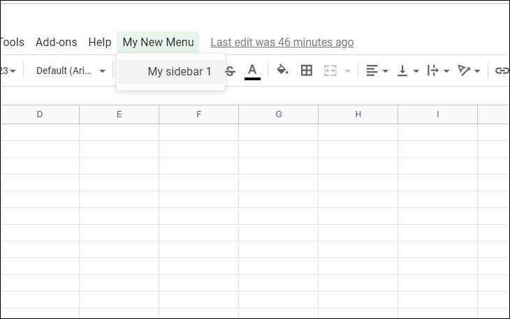 Step 7: After authorizing, return to your Google Sheet and refresh the page. You will now see a new menu item called My New Menu in the menu bar. Click on it and select My sidebar 1 to display your custom sidebar.