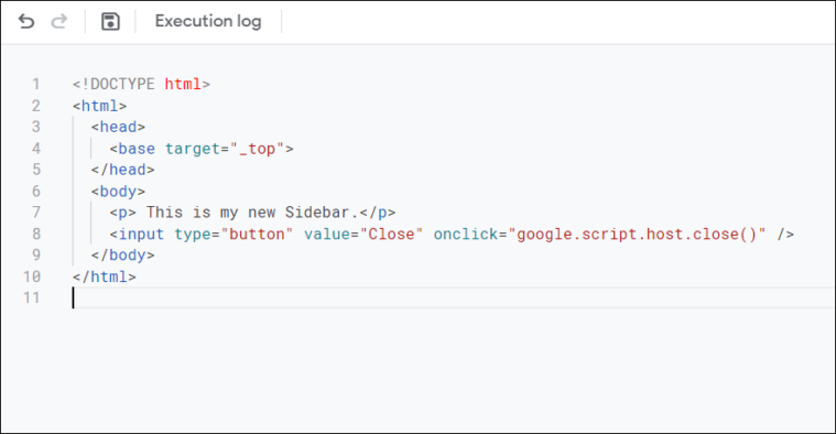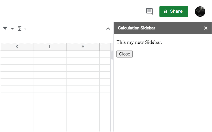 Your custom sidebar will now appear on the right side of the Google Sheets window, displaying the text and the Close button you added. Clicking the button will close the sidebar.
