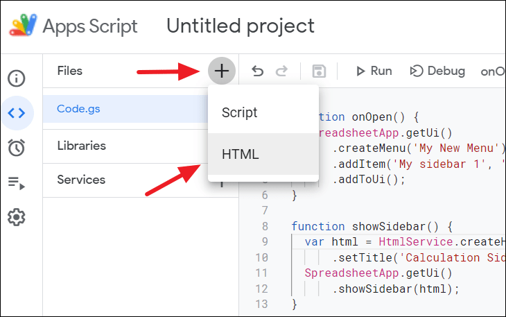 Step 3: In the Apps Script editor, create a new HTML file for your sidebar content.