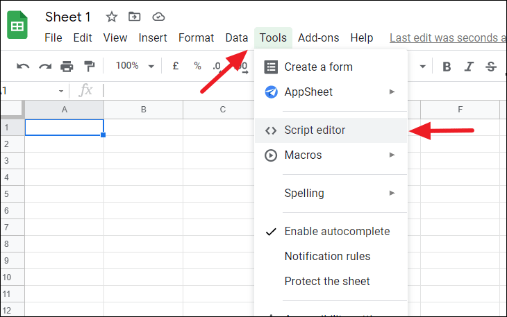 Step 1: Open your Google Sheets document. From the menu bar, click on Tools and select Script editor.