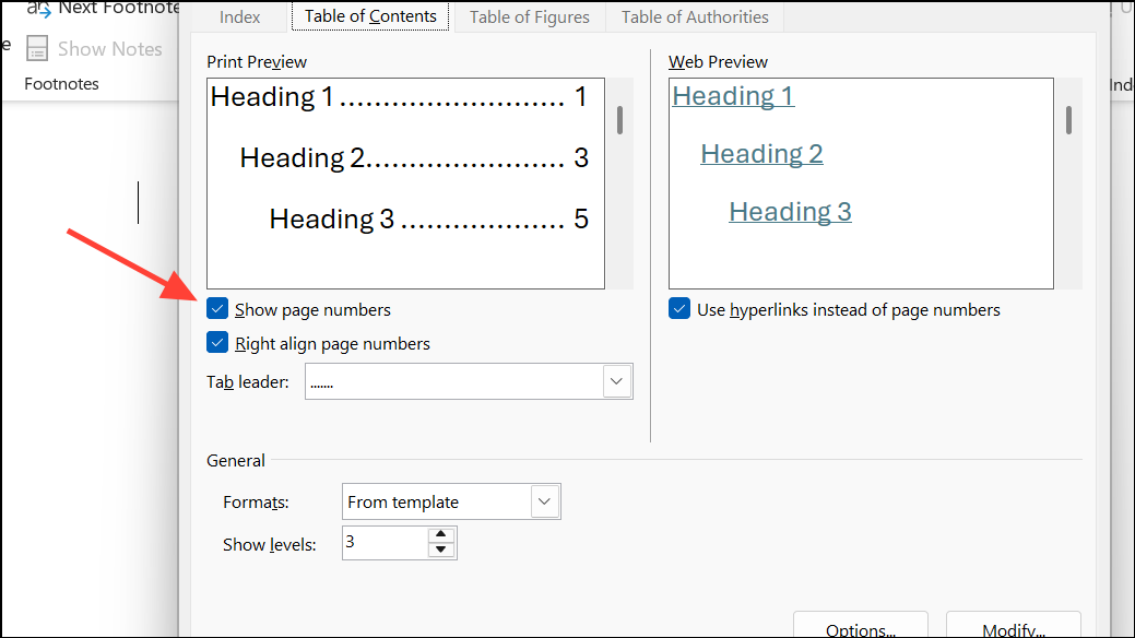 Step 3: In the dialog box, uncheck the Show page numbers option. The preview updates to show a TOC without page numbers.