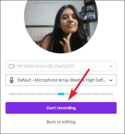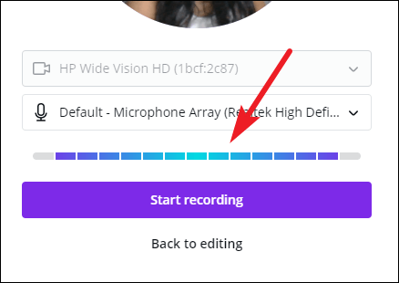 To check your microphone, say something. The bar beneath the microphone option will turn blue from gray if your microphone is working properly and Canva detects sound.