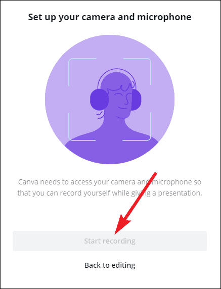 Once Canva has access to both, the ‘Start Recording’ button will become clickable. Canva needs access to both your camera and microphone for the Present and Record feature. If for some reason, access to either of these being blocked, you won’t be able to use the functionality.