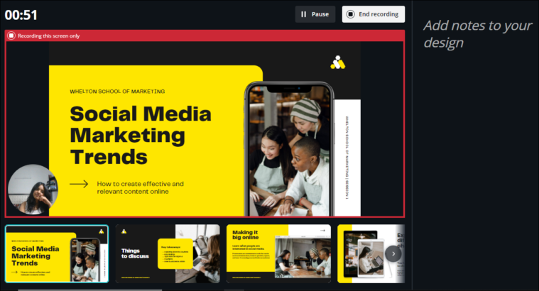 Canva is the perfect tool for your presentations. Not only can you create amazing presentations, but it also provides tools for what comes after. Like presenting it in circumstances when you cannot do it live. Recording the presentation adds that personal touch that simply sending it to people cannot capture.