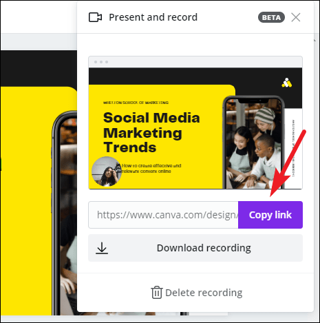 The Present and Record menu will open, and it will have the link to the recording as well the options to download and delete it. If you want to re-record, you’ll first have to delete this recording.