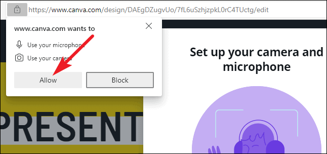 Your browser will display a pop-up that Canva wants access to your camera and microphone. Click ‘Allow’.