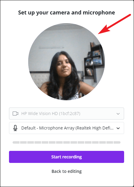 Before proceeding, check that your camera and microphone are working. You can see the preview of your video in the pop-up. You can also adjust your camera based on this preview, as this bubble represents how your video will appear while recording the presentation.