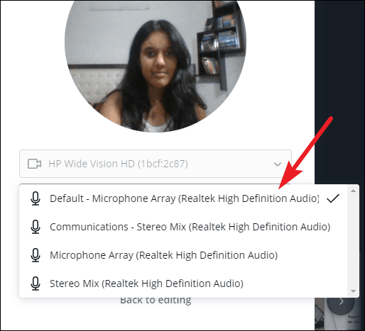 You can also change which camera or microphone to use (in case you have multiple) from the drop-down menus.