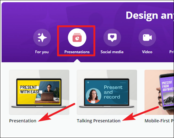 Go to canva.com and click on ‘Presentations’ to get started. It’s better to start with a template instead of a blank slate, but you can do either. Canva has a different category for ‘Talking presentations’. But it doesn’t matter whether you choose ‘Presentations’ or ‘Talking Presentations’, you can record for both types.