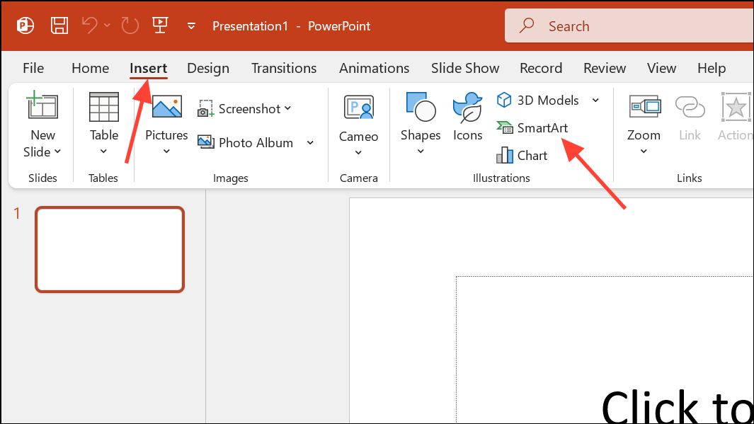 Step 2: Go to the Insert tab on the ribbon and select SmartArt from the Illustrations group. This opens the SmartArt Graphic dialog.