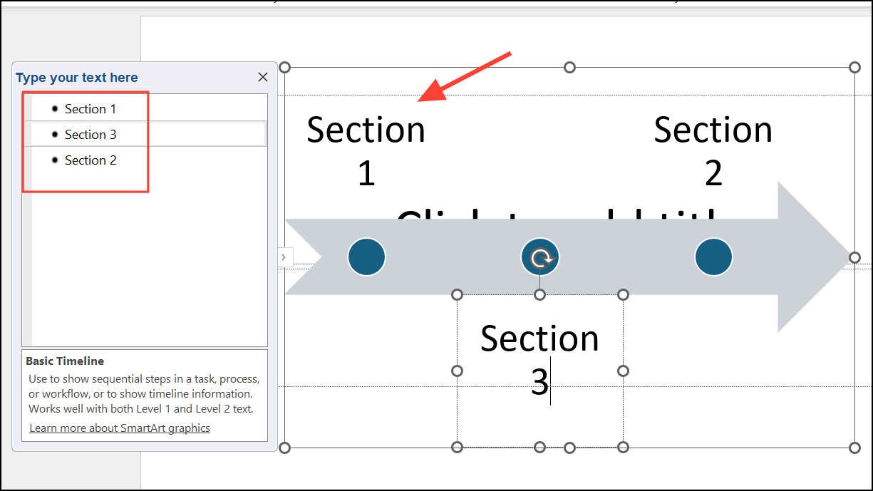 Step 4: Enter your timeline data. You can type directly into the placeholder text boxes on the graphic, but using the Text Pane (accessible via the small arrow on the left of the SmartArt) allows for faster entry and easier addition of new milestones. Press Enter to add more events, and use Shift + Enter to insert a line break within a milestone for separating dates and descriptions.