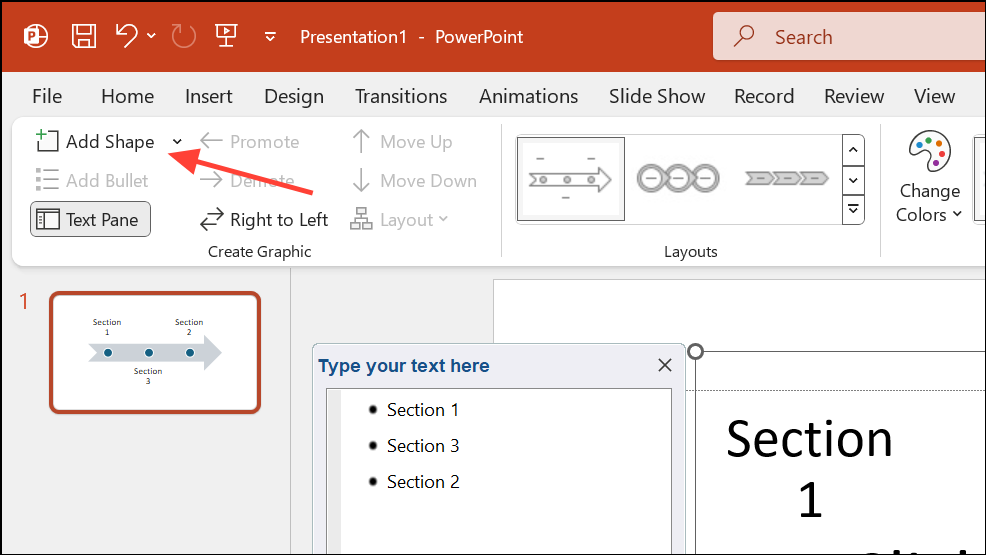 Step 5: To add more milestones, select a shape in the timeline, then use the Add Shape option in the SmartArt Design tab. Choose Add Shape After or Add Shape Before to control the placement of new items.