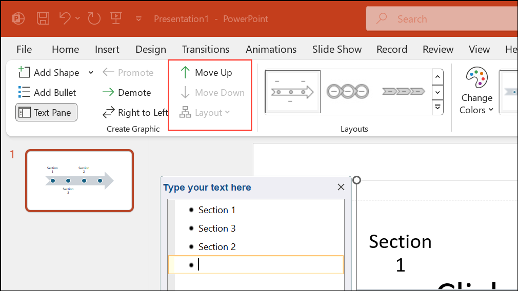 Step 6: Rearrange milestones by selecting a date and using Move Up or Move Down in the SmartArt Design tab. This adjusts the sequence of events on your timeline.