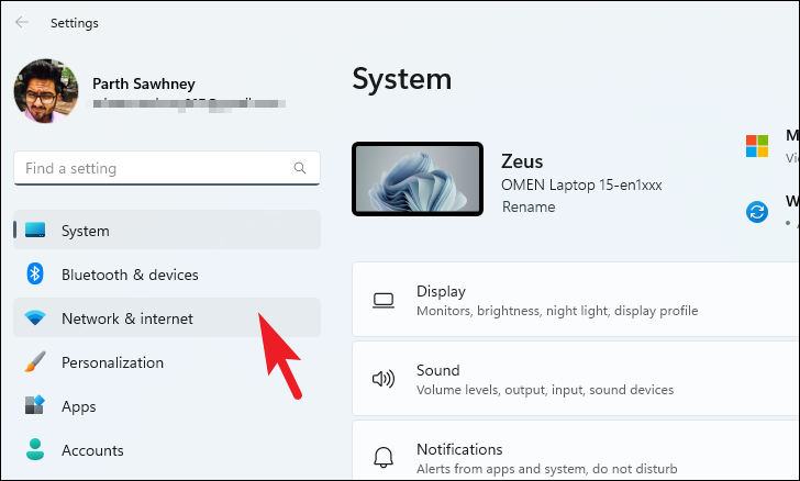 Step 2: In the Settings window, click on Network & internet from the left-hand menu.