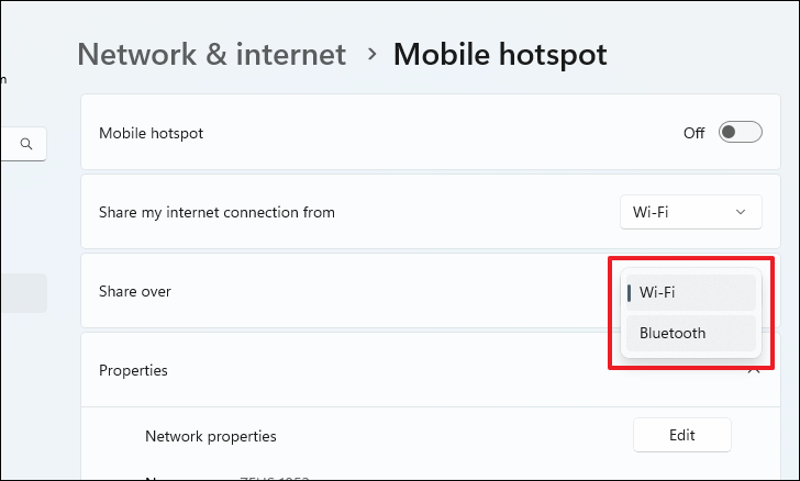 Step 5: Under Share over, choose the method you wish to use to share your connection. You can select Wi-Fi or Bluetooth. If you have an Ethernet connection, that option will also be available.