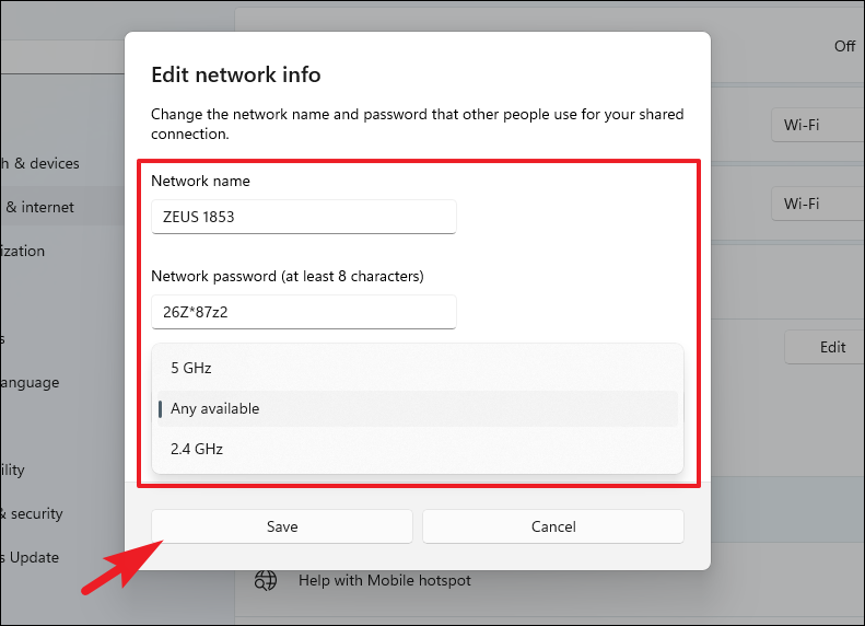 Step 7: In the pop-up window, enter a preferred network name and a secure password. Then, select a network band from the drop-down menu. Note that the available options may vary depending on your device's network card. Once you've made your selections, click Save to confirm.