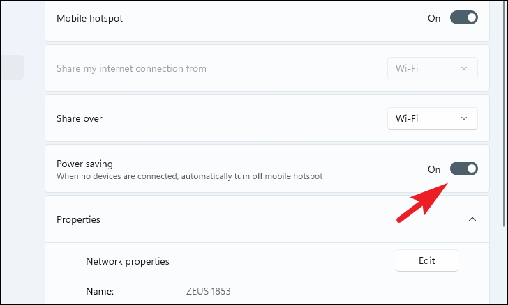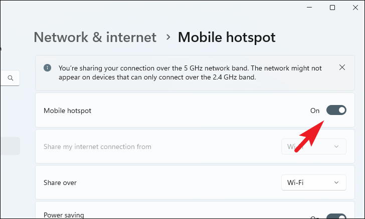 Optional: If you want the hotspot to automatically turn off when no devices are connected, enable the toggle next to Power saving.