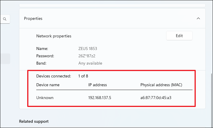 Once the hotspot is enabled, you can view connected devices on the same page. Windows 11 allows up to eight devices to connect simultaneously.