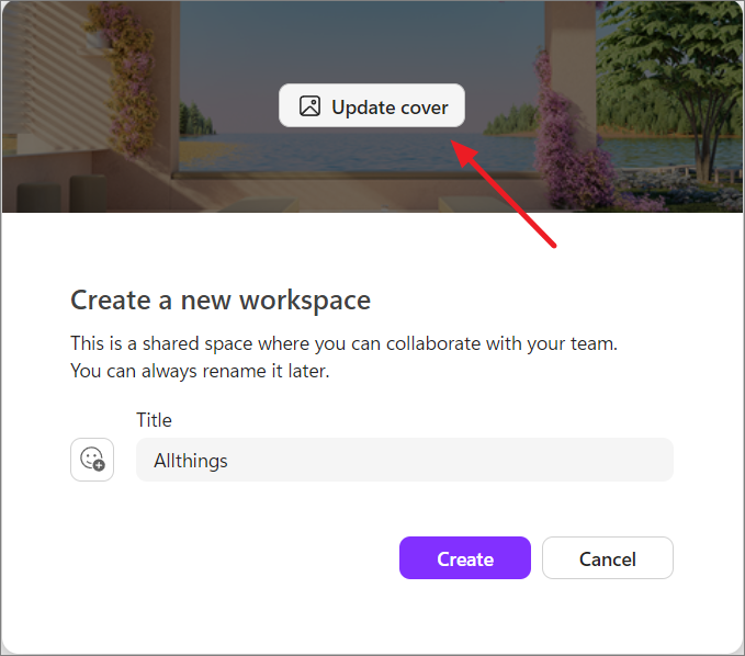 After typing the name, hover over the cover of the image and click the 'Update cover' to change the cover image.