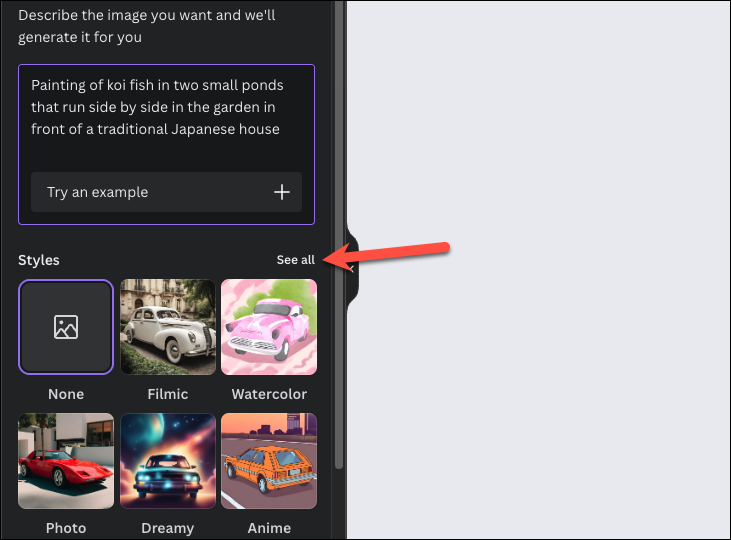 - Next, choose the style you want to use for your generation (optional). Magic Media offers a range of styles to choose from, like Photo, Dreamy, Watercolor, Psychedelic, and Ink Print, to name a few. Click on the 'See All' option to see the full list of options.