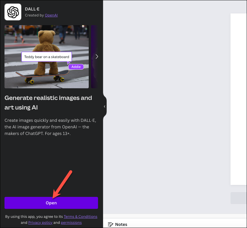 For times when Canva's Magic Media might not deliver desired results, or you've run out of credits, you can use the third-party apps, OpenAI's DALL-E and Google's Imagen, to generate images from your text descriptions. The process is similar to using Magic Media and entirely the same for both apps. So, we'll illustrate the steps using DALL-E for this guide.