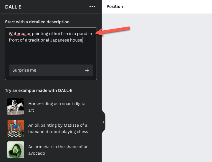 - Then, provide a description of the end look you want, i.e., what you want to transform the element into. Try to provide concrete details about what you're envisioning, like an object, color, location, or surroundings.