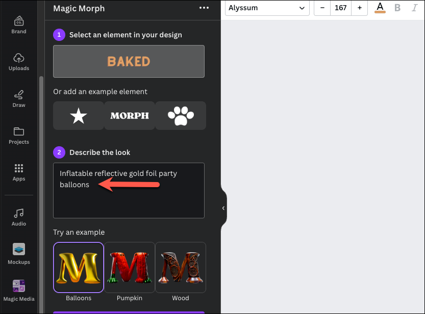 Magic Morph also works better with bolder, thicker text fonts or images that have a lot of area to morph, in comparison to thin fonts, semi-transparent images, or text within shapes. Moreover, it works better with prompts like naturally occurring patterns (zebra stripes, candy canes, snakeskin, or rocky paths) instead of creating your own patterns like a row of tiny rubber duckies. Also, keep your instructions instructive rather than abstract, like "make it ethereal."