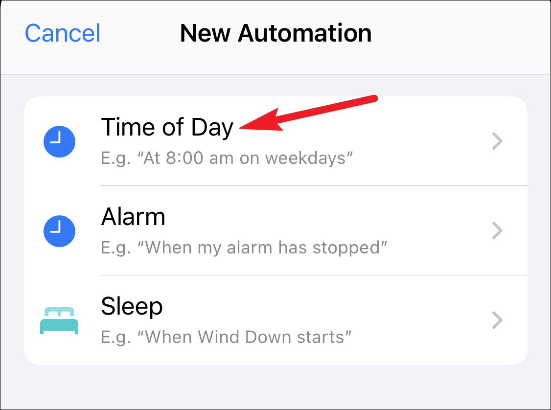 Tap on the one you want. For the sake of this guide, let’s take the example of the automation where you want to journal at a particular time every single day. You can automate your phone to open the journaling app you use. Tap on ‘Time of Day’ to create the automation.