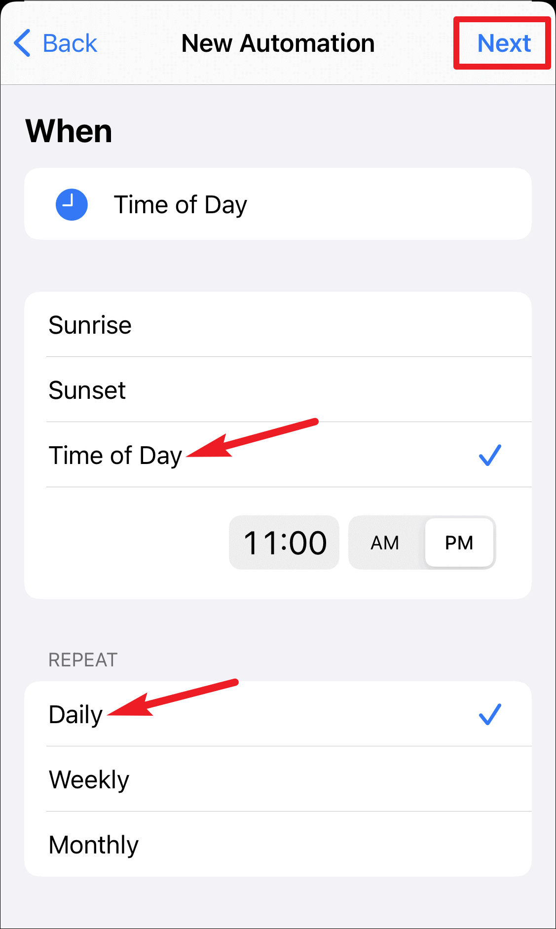 Now, configure the automation, i.e., details regarding when it should run. You can either select pre-defined times like Sunrise and Sunset or specify the time yourself. Also, select the frequency of the automation. You can select from options like ‘Daily’, ‘Weekly’, or ‘Monthly’. Here, we’ve configured the automation to run daily at 11:00 PM. Then, tap ‘Next’.