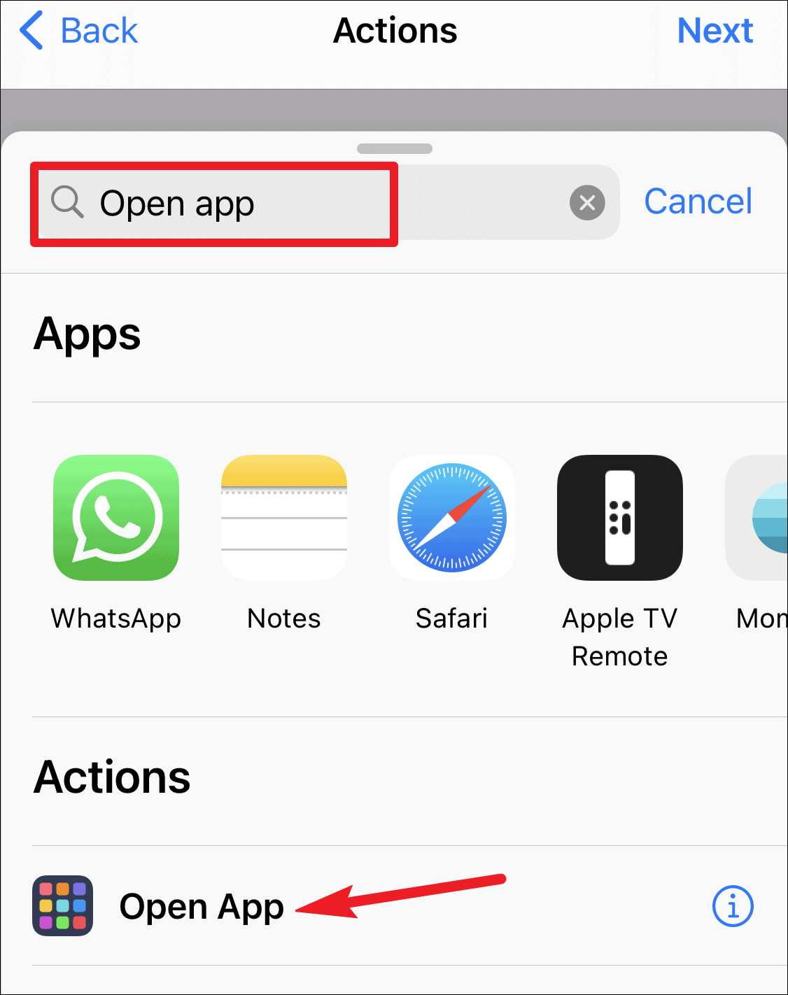 Then, enter ‘Open App’ in the search box and select the option with the colorful boxes as the icon.