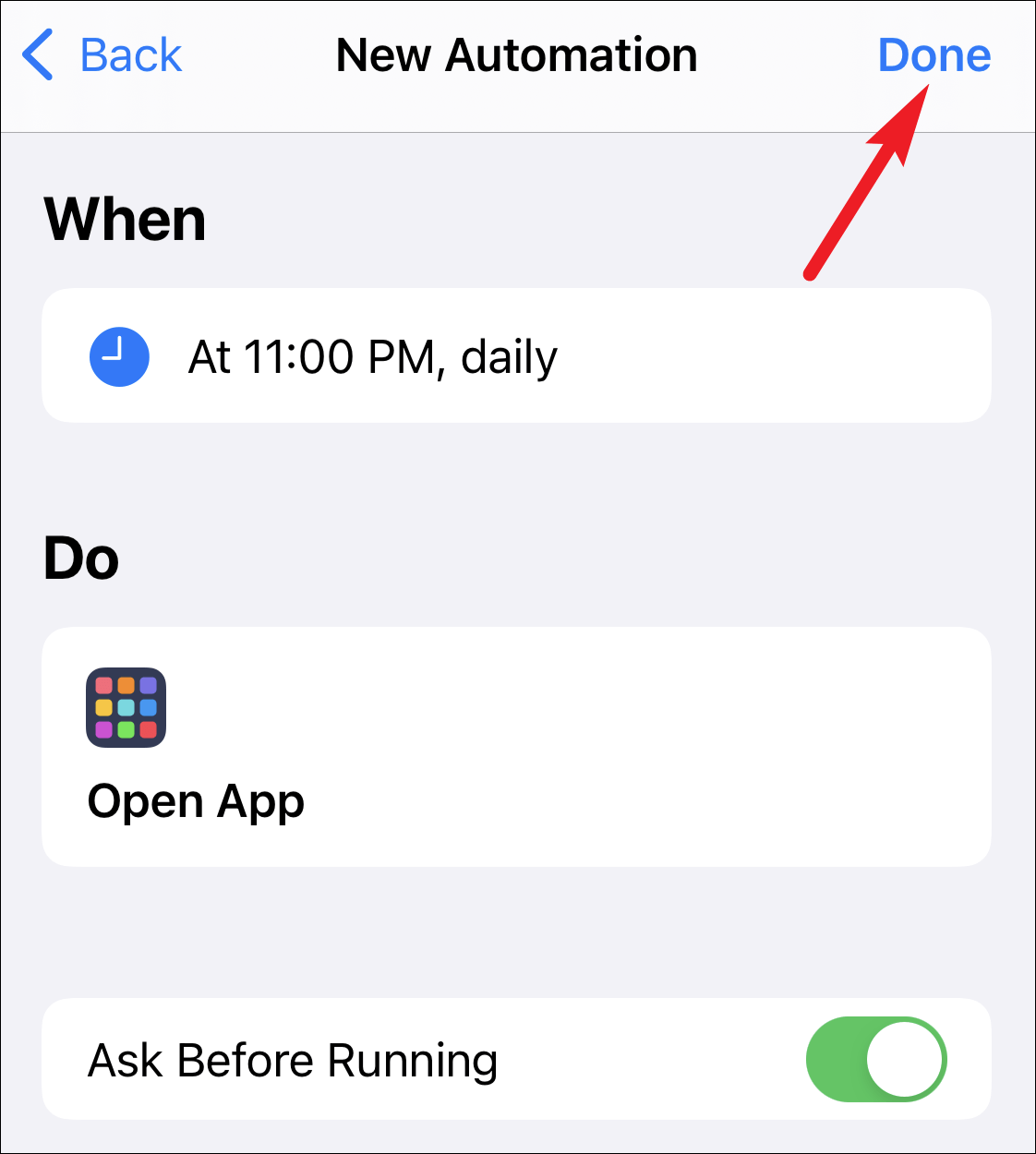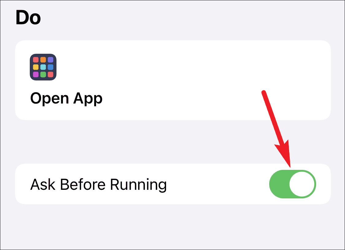 Now, if you want the automation to run on its own, turn off the toggle for ‘Ask Before Running’. This step is essential for any automation you wish should run truly automatically on your phone. But if you do want the choice to be able to select every day whether or not you want to run it, then keep the toggle on.