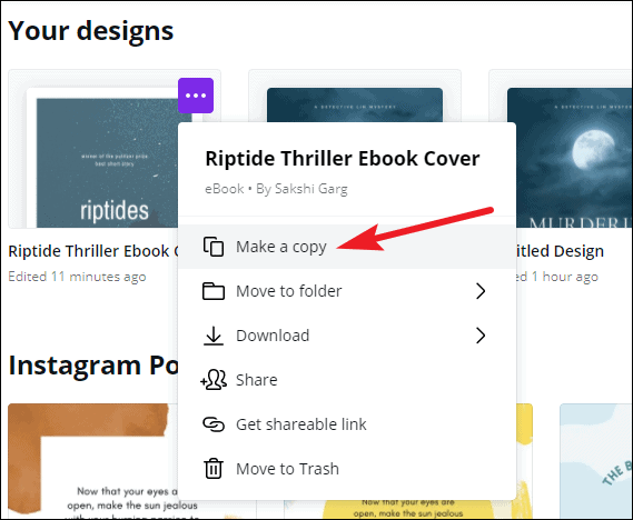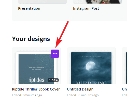 For a book with more pages, you can start a new design. Go to the Canva home page and then to ‘Your designs’. Hover on your eBook design, and click the three-dot menu.