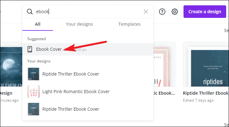 Go to the Canva home page, and search for eBook. But this time, click ‘Ebook Cover’ when it comes under suggestions.