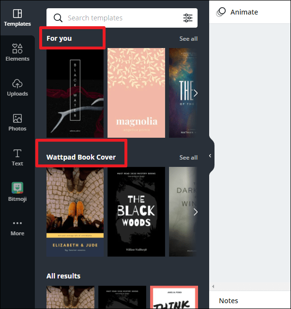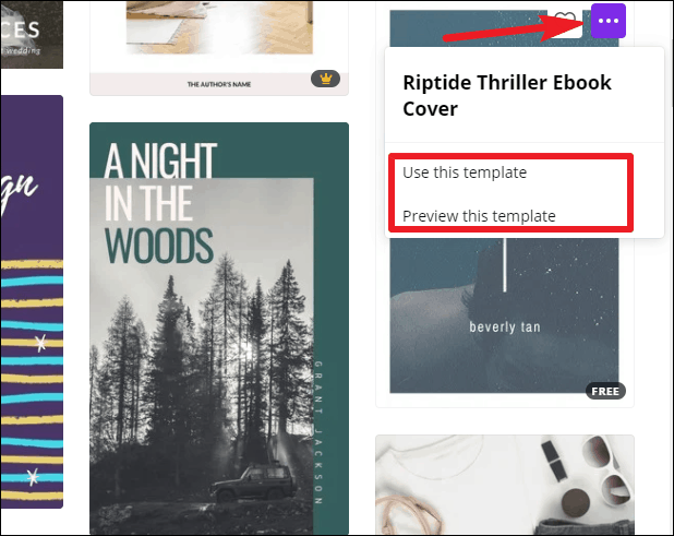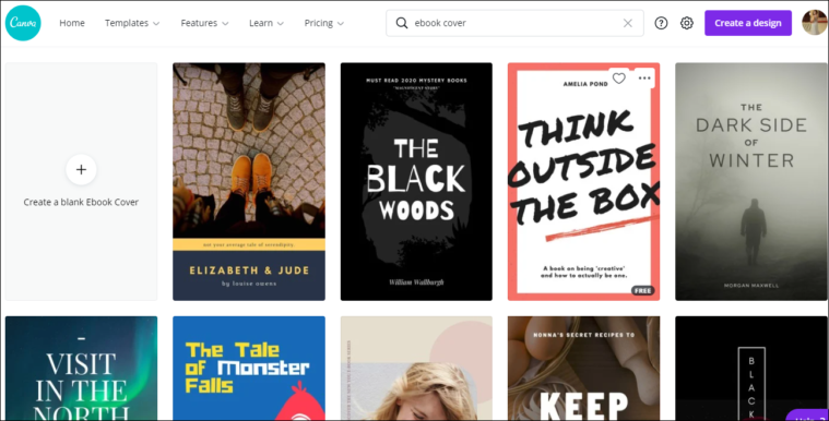 The templates for eBook covers will appear. Canva has templates for a lot of categories: thriller, romance, cookbook, inspirational story, etc. Browse through the templates to find one that works for you.