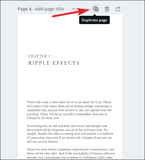 To increase the number of pages in your book, you can duplicate a page and edit it accordingly. For example, the book needs more pages with the story. So, in this template, go to page 4 and click the ‘Duplicate’ button to add a similar page. Your Canva eBook can have a maximum of 100 pages.
