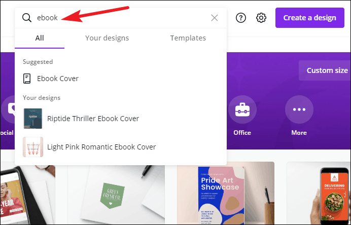 Either go to canva.com on your browser or open the app. Go to the search bar and type ‘ebook’. Generally, when you type a keyword in the search bar, one of the suggested options that appear underneath is what you’re looking for, and clicking it will take you to the templates for the desired category. But in this case, the only suggested option that appears is ‘Ebook Cover’. Instead of clicking it, what you want to do is press the enter key after typing ‘ebook’.