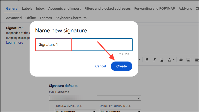 - In the pop-up that appears, type the name of your signature and then click on the 'Create' button.