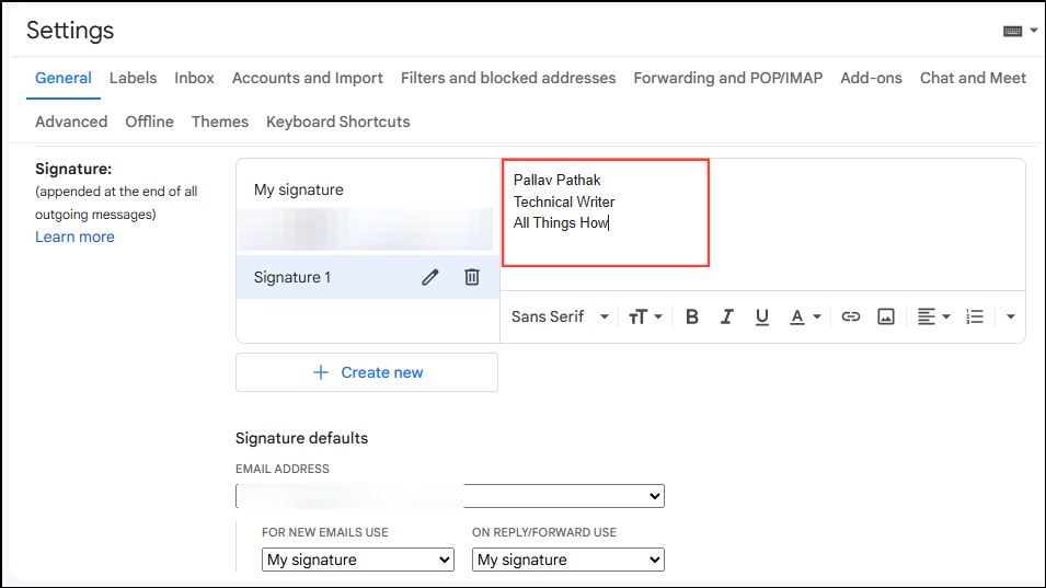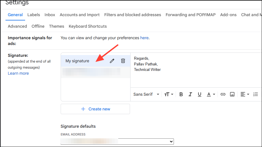 - When the Settings page opens, scroll down to the 'Signature' option and click on 'Create new'.