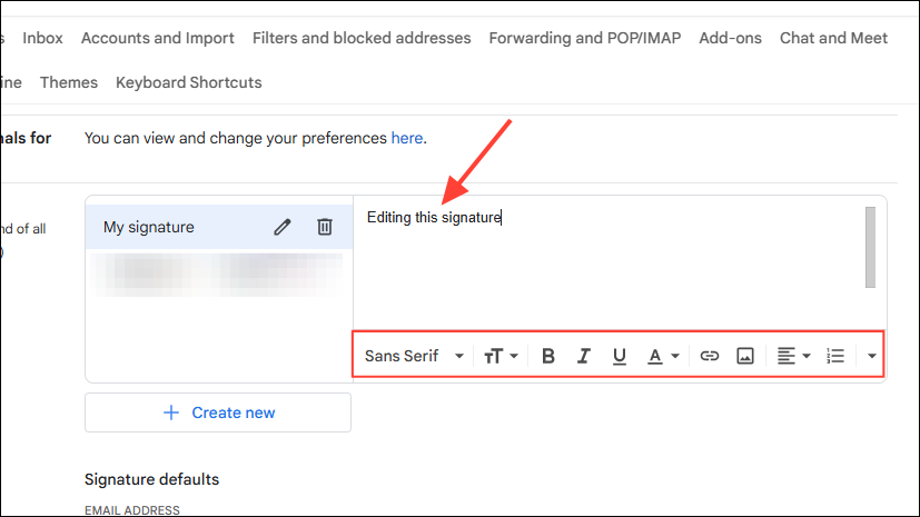 - Now you can click on the right and edit your signature as you want. You can even use the various formatting options at the bottom to change the font of your signature, make it bold, italicized, or underlined, and even add an image.