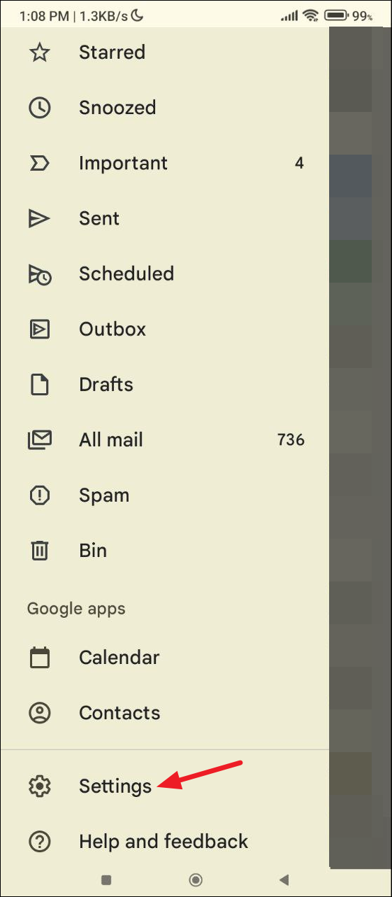 - Open the Gmail app and navigate to Settings from the hamburger menu.