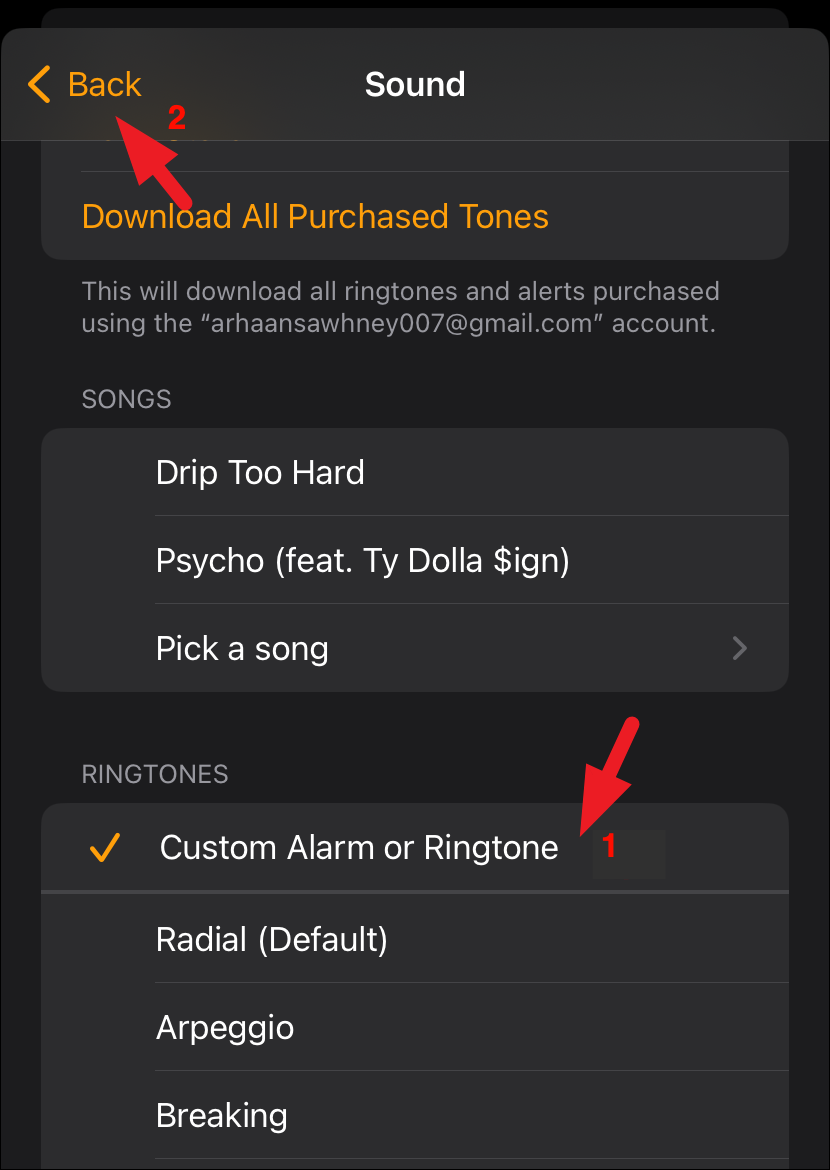 - You shall be able to see your custom audio under the 'Ringtones' section. Tap on the ringtone you created previously using Garage Band. Once selected, tap on 'Back'.