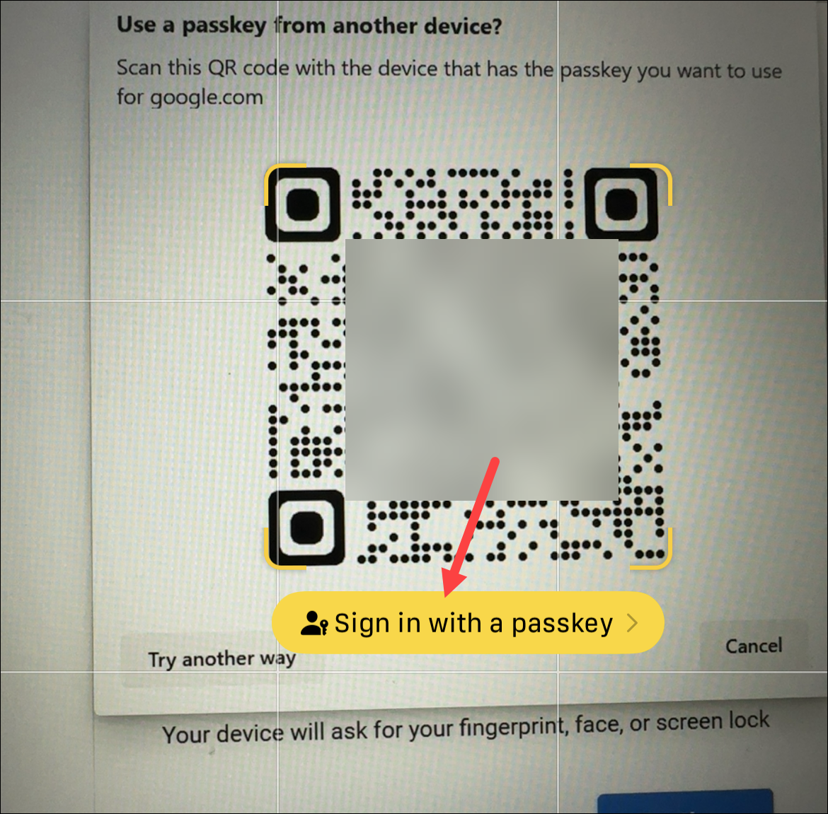 A QR code will appear on your screen. Open your phone's camera and scan it. Tap the 'Sign in with a passkey' option. Then, confirm your identity using biometrics.