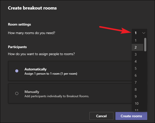 A small window for creating breakout rooms will appear. First, select the number of rooms you want to have from the drop-down menu. You can have a maximum of 50 breakout rooms in Teams.