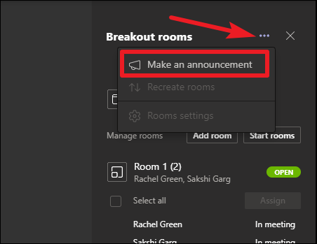 Participants in the breakout rooms will be able to read the announcement from the chat. Breakout Rooms chat is also available after the meeting in your main Teams chat list.
