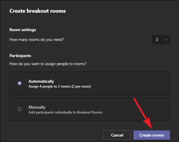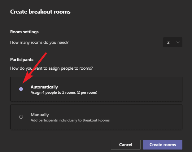 Then, select whether you want to automatically assign attendees to breakout rooms or manually. If you select automatically, Teams will evenly divide the participants to the breakout rooms at random. To illustrate, if there are 6 participants other than you and 3 breakout rooms, it’ll assign 2 people to each room.
