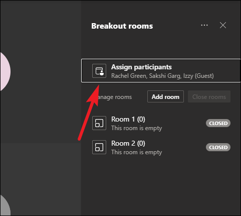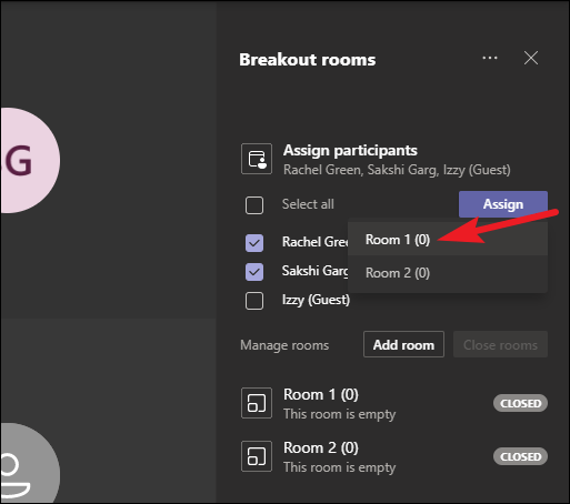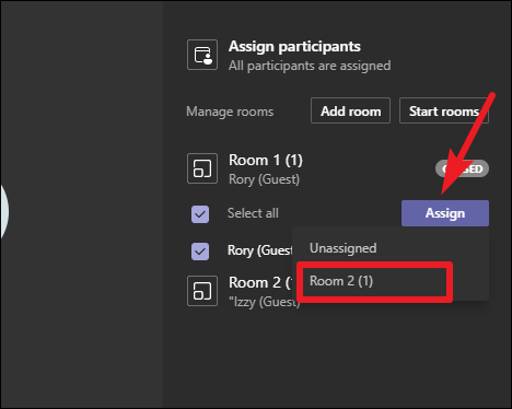 The list of rooms will appear. Select the room for the people you have selected, and they’ll be assigned to that room. Repeat the above steps until all participants are assigned to their respective rooms.