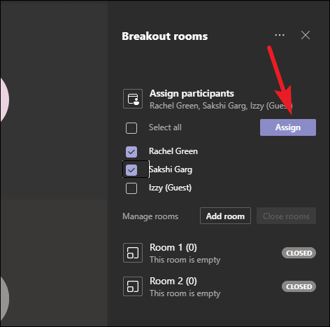 Select the name(s) of people you want to move, and click the ‘Assign’ button. Then, either select another room to move them into or select ‘Unassigned’ to move them out of breakout rooms completely.