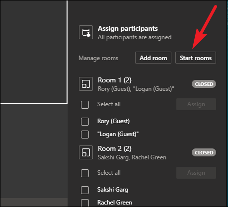 Whenever you’re ready to move participants to the rooms, click the ‘Start Rooms’ option. This’ll automatically move all the participants to their assigned rooms.