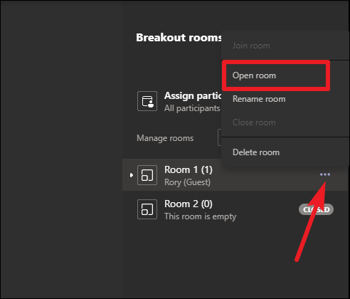 You can also start rooms individually. Go to that room and hover on it. The ‘More Options’ icon (three-dot menu) will appear; click on it. Then, select ‘Open Room’ from the menu.